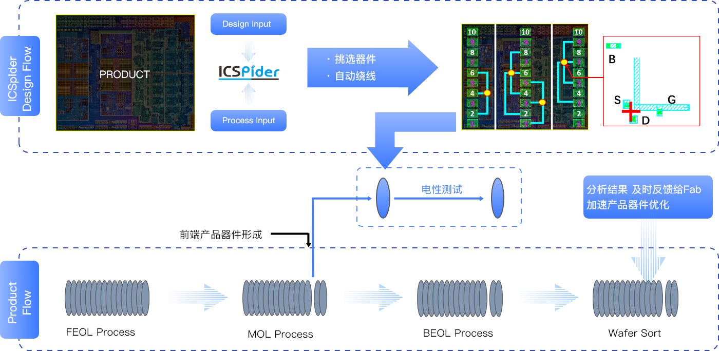 在一个技术开发项目中,公司通过ICSpider工具设计的产品诊断芯片,对产品中大量器件进行实际性能的测试,发现在数以百万级的器件中,部分器件电性参数偏离模型、速度过快。 通过对设计版图的仔细分析,发现该部分器件的设计特征共性与性能偏离的物理原因。一方面,项目组将该发现反馈到代工厂的技术团队,进行有针对性的工艺排查;另一方面,通过改进版图、生成新的光罩,直接调整相应的器件特性,在保持产品速度性能的前提下,降低了芯片的整体功耗。