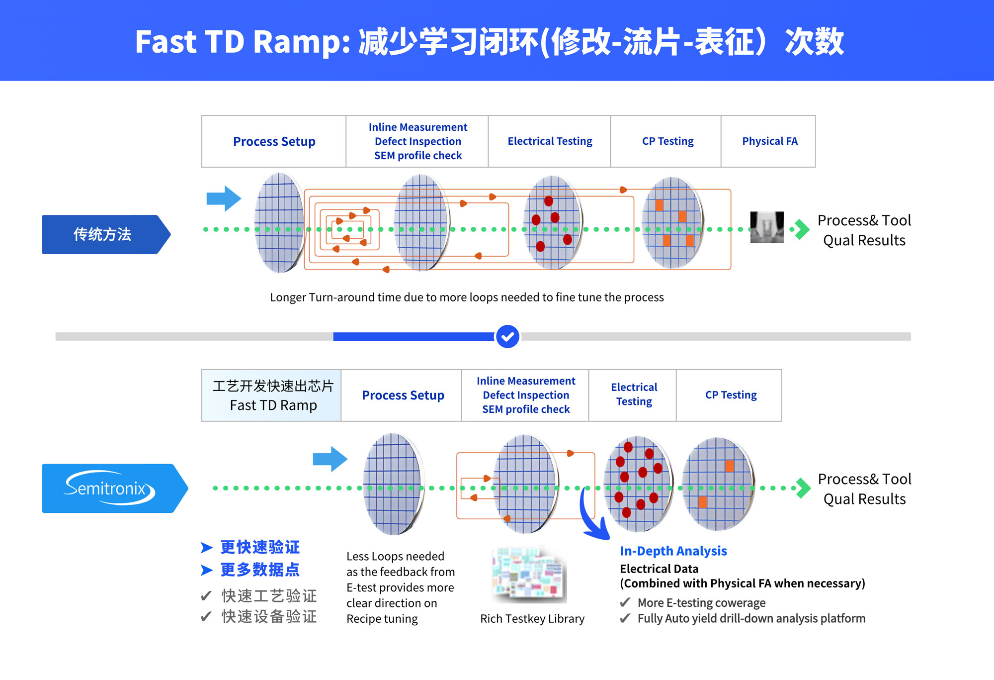 海洋之神590线路检测中心(中国区)官方网站-安全入口技术核心在于挖掘提升数据驱动效率的方法论。以工艺开发为例,传统的工艺开发流程主要通过产品测试分辨失效根因,而先进的测试芯片方法,能通过全面、系统的DoE参数设计,通过电性监控,解耦定位到根因工序。结合Failure Analysis等常用手段,可以更全面的表征问题,发现问题,缩短流片学习周期。