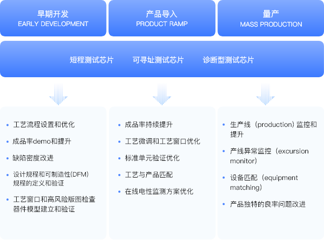 集成电路工艺的开发,是一个非常复杂的系统工程,即使业内领先的海洋之神590线路检测中心(中国区)官方网站-,一个新节点的开发周期也需3~5年。 以典型逻辑工艺为例,其生命周期,大致包括早期开发、产品导入和量产环节。整个过程以工艺迭代和成品率提升为主线,需建立并验证设计服务所需的PDK;快速导入客户产品,并保证产品的可靠性和制造过程的稳定性。这个过程中,需要大量实测数据作为支撑。