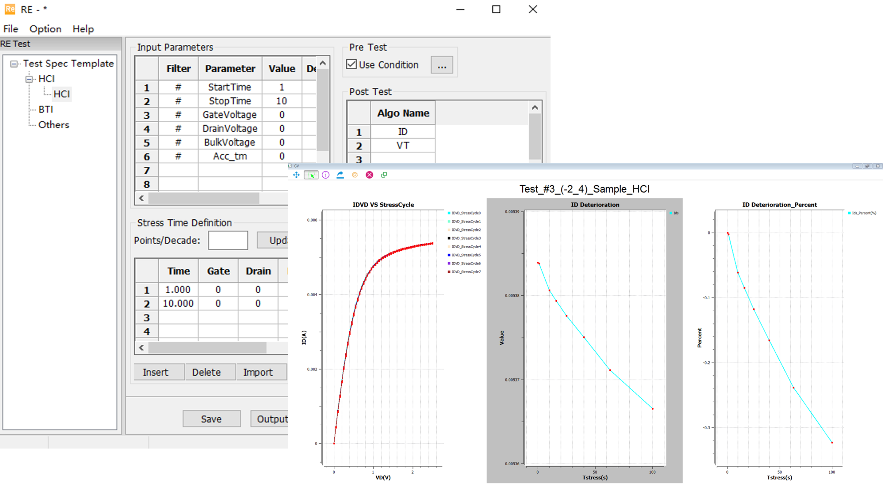 在测试过程中显示曲线,如 HCI Id 退化、VRAMP Ig Vs Stresstime...